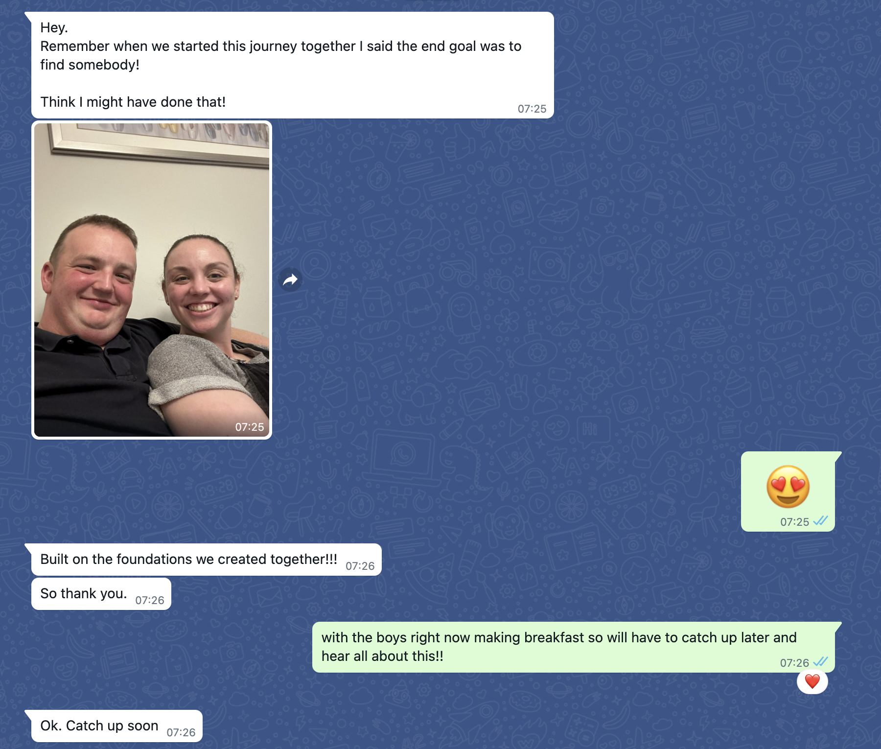 "Simon's personality is fantastic as he is caring but also really good at making you believe you can do anything ... even if you don't believe it yourself in the moment! Working with Simon has changed my life as not only have I lost 8 stone BUT I have such a renewed sense of self esteem that I am now in a happy relationship which turned out to be the root of what I REALLY wanted but didn't think I was worthy of."